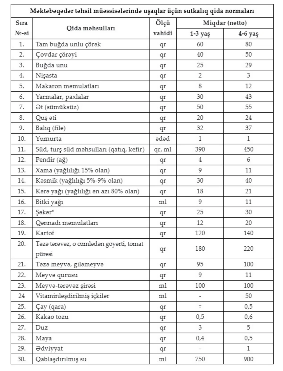 Qeyd edək ki, Nazirlər Kabinetinin 2025-ci il 21 oktyabr tarixli 314 nömrəli Qərarı ilə məktəbəqədər təhsil müəssisələrində uşaqlar üçün sutkalıq qida normaları müəyyən edilib