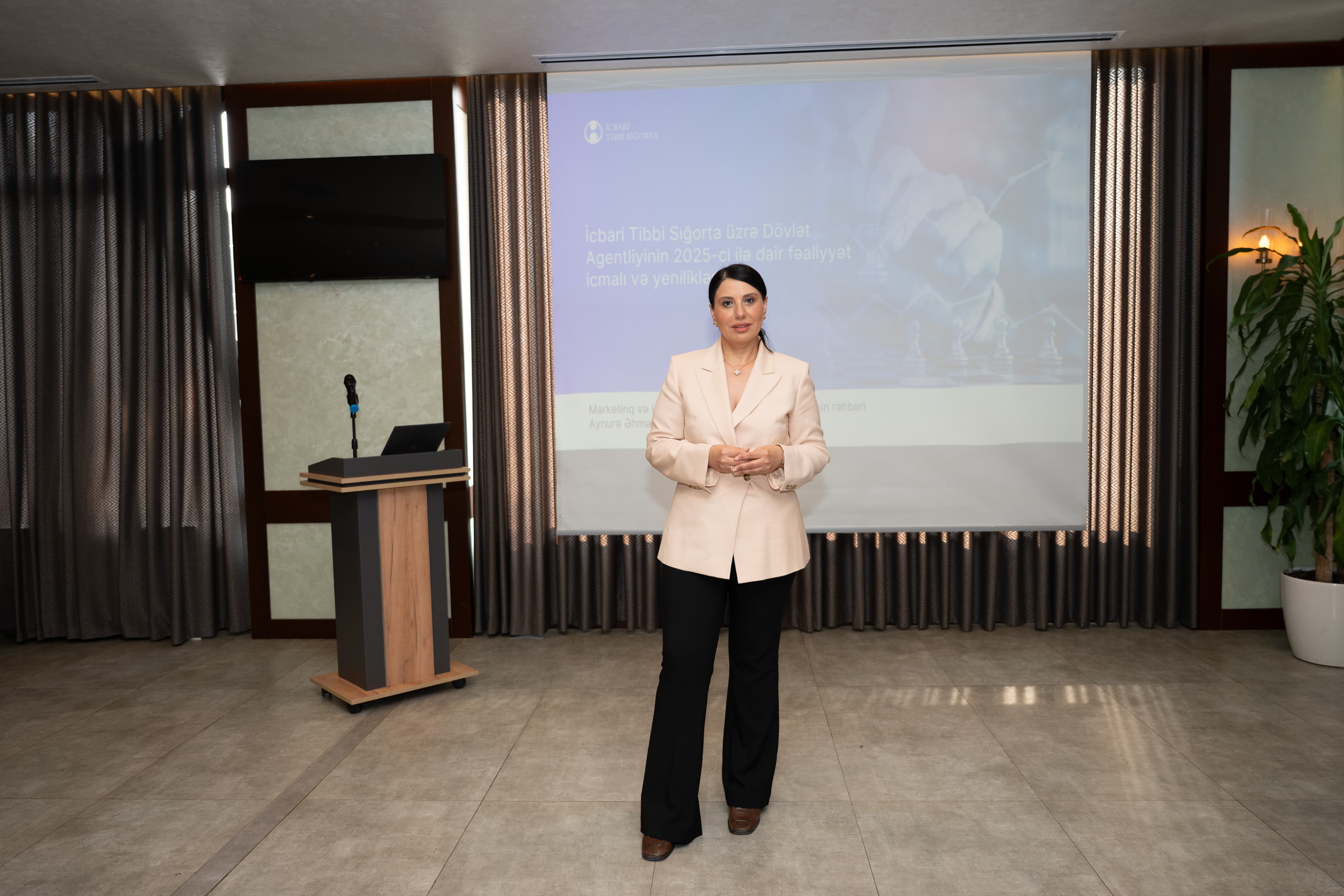 Agentliyin Marketinq və ictimaiyyətlə əlaqələr departamentinin rəhbəri Aynurə Əhmədova təqdimatla çıxış edərək bildirib ki, jurnalistlərin maarifləndirmə prosesində rolu təkcə məlumat ötürməkdən ibarət deyil, həm də ictimai etimadın formalaşdırılması baxımından əhəmiyyət daşıyır. Onun sözlərinə görə, bu ilin ilk 10 ayında ölkə əhalisinin 50%-i icbari tibbi sığortadan istifadə edib: “Müraciətlər üzrə 77 milyondan çox tibbi xidmət göstərilib ki, bu da ötən ilin eyni dövrü ilə müqayisədə 12% artım deməkdir. Özəl tibb müəssiələrində icbari tibbi sığorta çərçivəsində göstərilən xidmətlərin sayı bu ilin 8 ayı ərzində ötən ilin eyni dövrü ilə müqayisədə 18% artıb”.