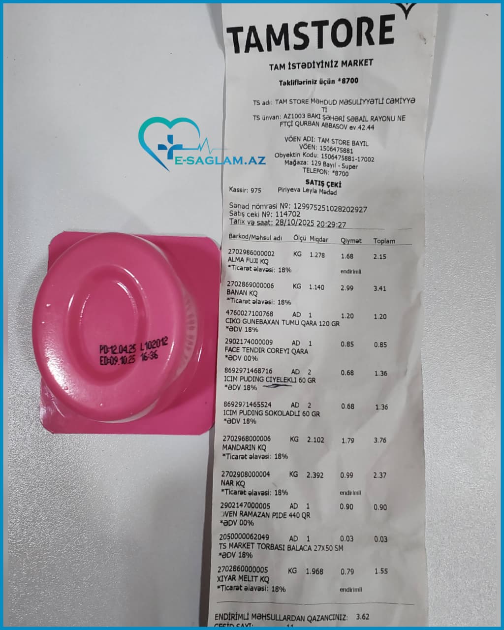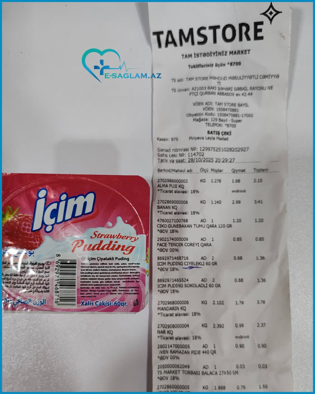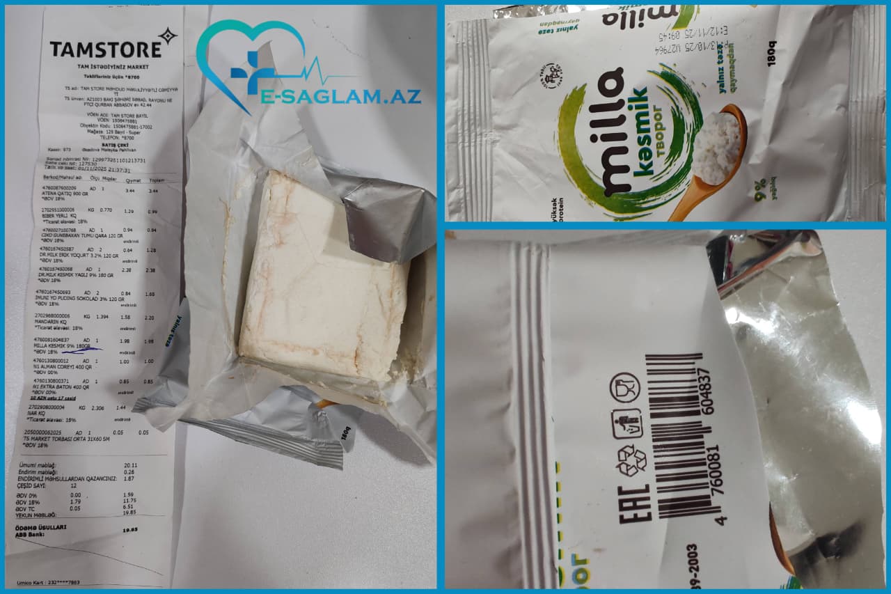 E-saglam.az saytına daxil olan şikayətə əsasən, "Tamstore Marketlər Şəbəkəsi"ndən 2 dəfə ard-arda alınan məhsullar xarab çıxıb. Birinci məhsul "İçim" markasına məxsus pudinq - istifadəyə yararlılıq müddəti 19 gün öncə bitib. Digəri isə "Milla" şirkətinə məxsus kəsmik - istifadə müddəti bitməsə də, məhsul alınarkən içi saralıb və pis qoxu gəlir. Şəkillərdə daha detallı göstərilib.